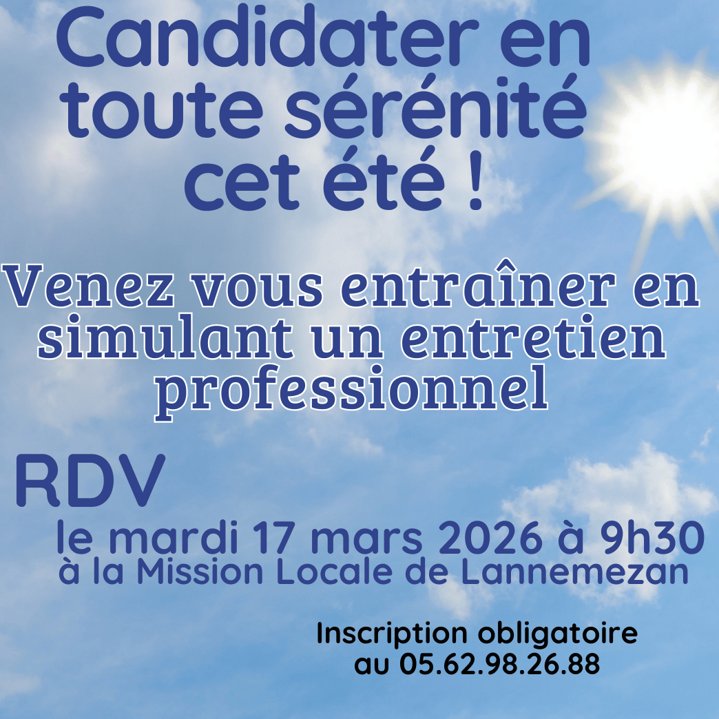 Vous êtes interéssé(e)s, inscrivez-vous auprès de la Mission Locale de Lannemezan. Inscription obligatoire 05 62 98 26 88 (nombre de place limité).